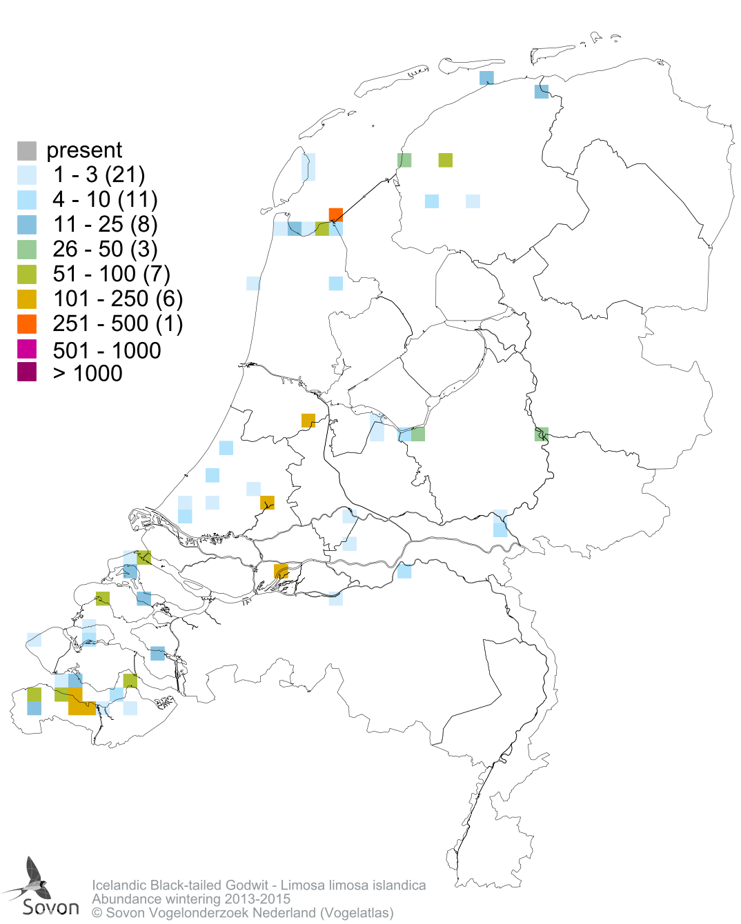 Numbers and distribution of breeding- and wintering birds in The Netherlands